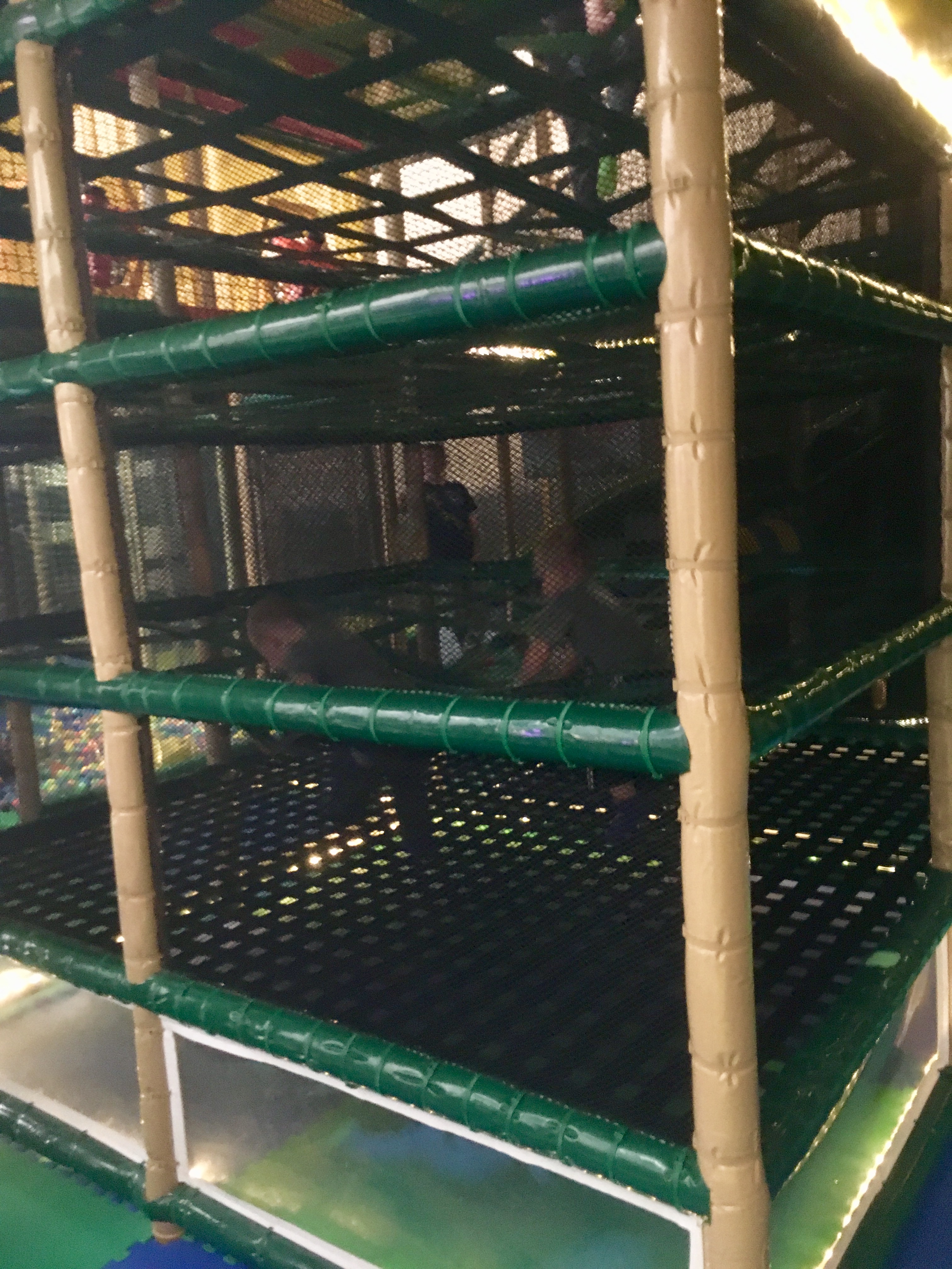 The Adventure Kids love exploring the four-level indoor playground at Kid’s Planet. This area is designed for kids ages 3-14. Inside of the enclosed playground, there are: