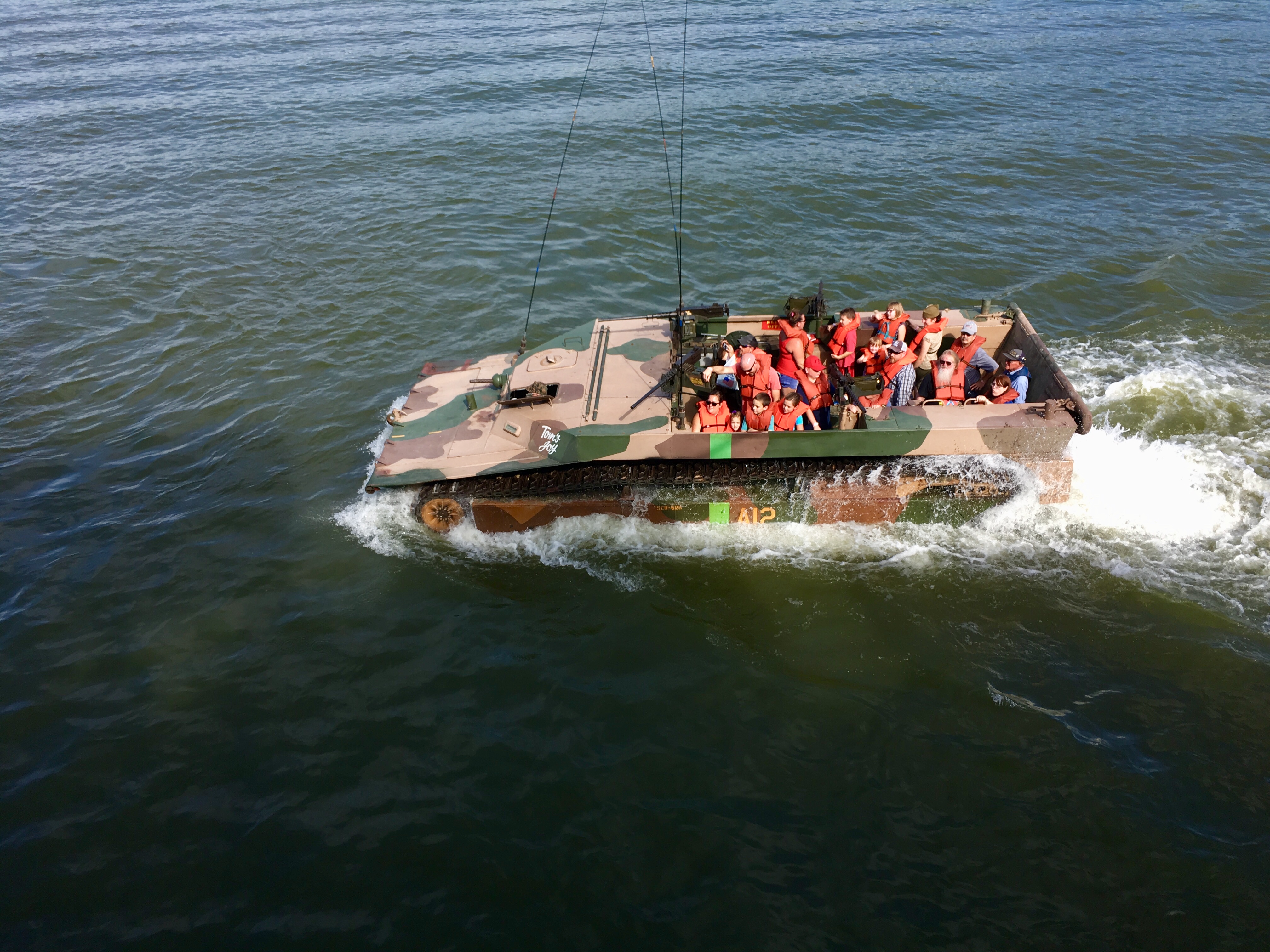 We took free rides on an amphibious tank named “Tom’s Joy.” We walked onto the tank on land, and then went onto the river for a 5-minute once-in-a-lifetime spin.